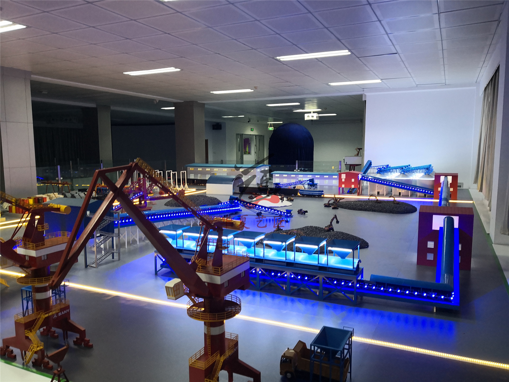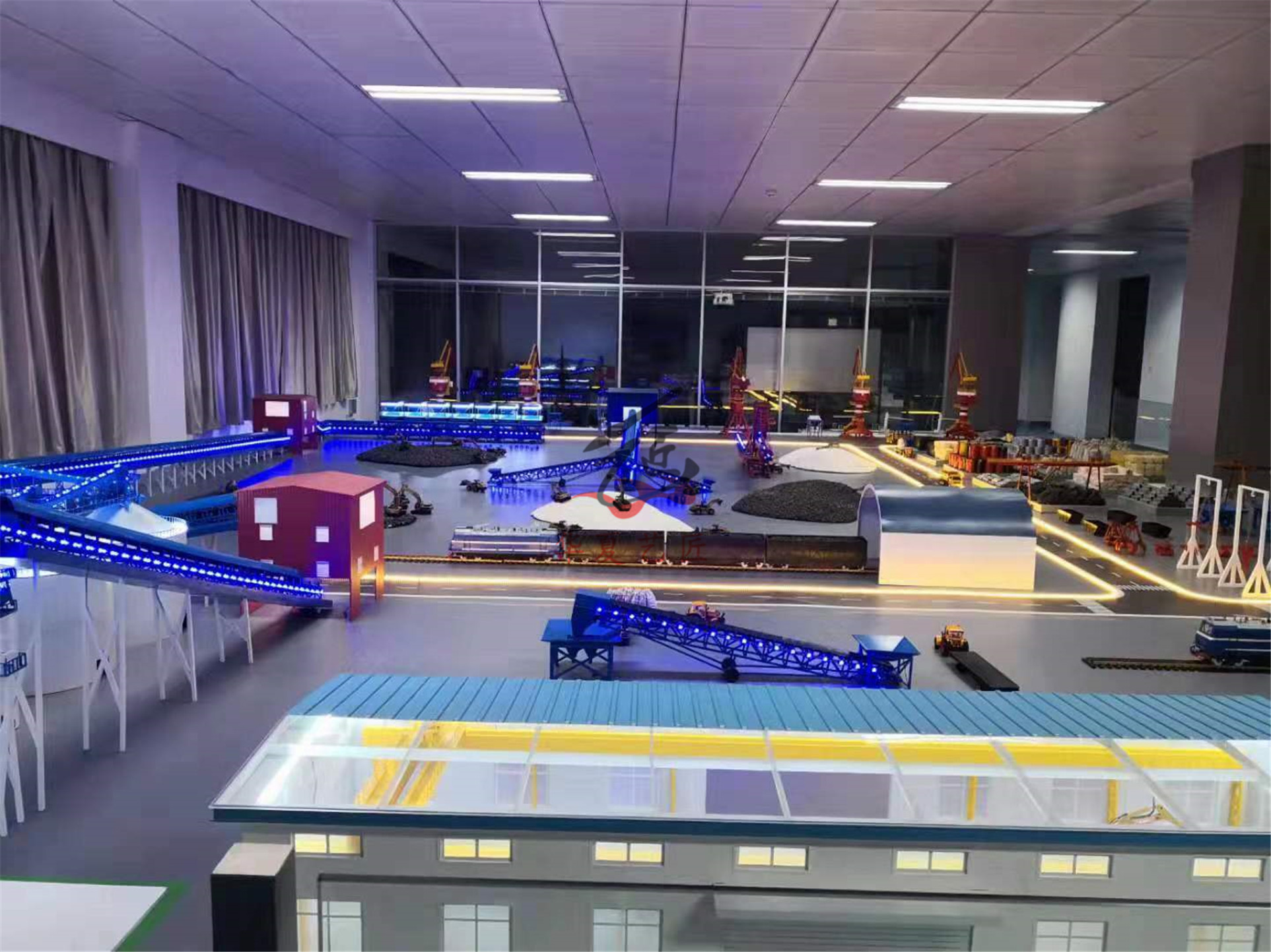 港口物流教學(xué)模型是以青島前灣港港區(qū)為沙盤模型藍(lán)本,融合散糧作業(yè)系統(tǒng),制作成集集裝箱作業(yè)、件雜貨作業(yè)、散糧作業(yè)、煤炭作業(yè)、鐵礦石作業(yè)、油品作業(yè)為一體的多貨種全功能的港口裝卸流程沙盤布局。港區(qū)分為集裝箱碼頭、件雜貨碼頭、固體散貨碼頭、液體化工碼頭四種類型,其中在件雜貨碼頭后方增加散糧筒倉系統(tǒng),